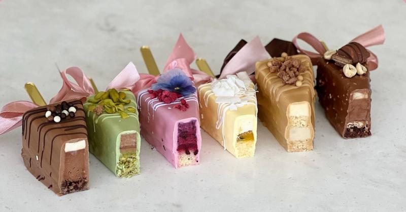 - Фисташка-молочный шоколад (фисташковый бисквит, мусс на молочном шоколаде, фисташковый крем, хрустящий слой)